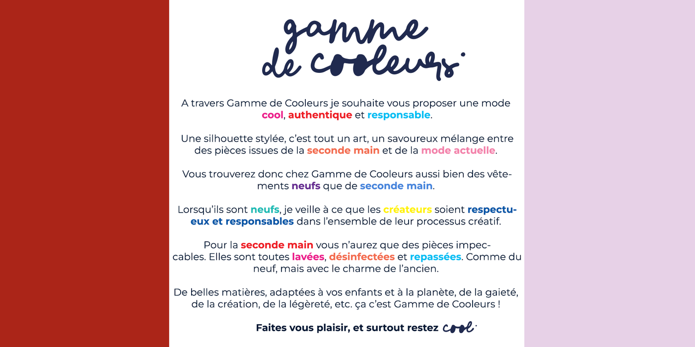 J’ai crée Gamme de Cooleurs pour proposer une collection unique de vêtements pour enfants. Unique car je mixe des vêtements et accessoires que je crée, avec des pièces de seconde main et vintage que je sélectionne.
